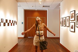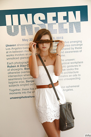 Brunette teen Alex Mae posing pantyless & flashing her tits on the sandy beach