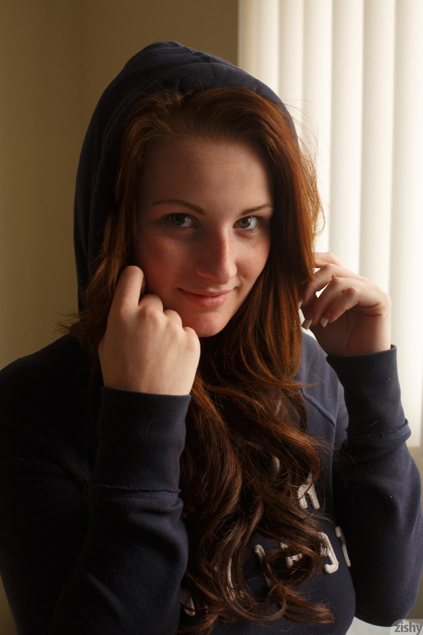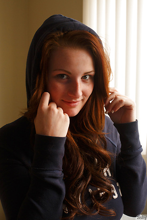 Sassy redhead girlfriend Emmy Sinclair shows her big tits and her juicy curves