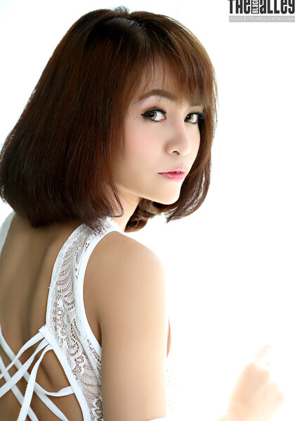 Pretty Asian girl Eileen fondles her big boobs before spreading her tight slit